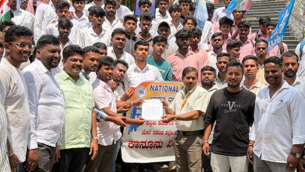 ಮುಖ್ಯ ನ್ಯಾಯಮೂರ್ತಿ ಬಿ.ಆರ್. ಗವಾಯಿರವರ ಮೇಲೆ ಶೂ ಎಸೆದು ಹೇಯ ಕೃತ್ಯ ಎಸಗಿದ ವಕೀಲ ರಾಕೇಶ್ ಕಿಶೋರ್ ನನ್ನು ಬಂಧಿಸಿ ಶಿಕ್ಷೆಗೊಳಪಡಿಸಲು ರಾಷ್ಟ್ರಪತಿಗಳಿಗೆ ಒತ್ತಾಯಿಸಿ ಎನ್ ಎಸ್ ಯು ಐ ಪ್ರತಿಭಟನೆ