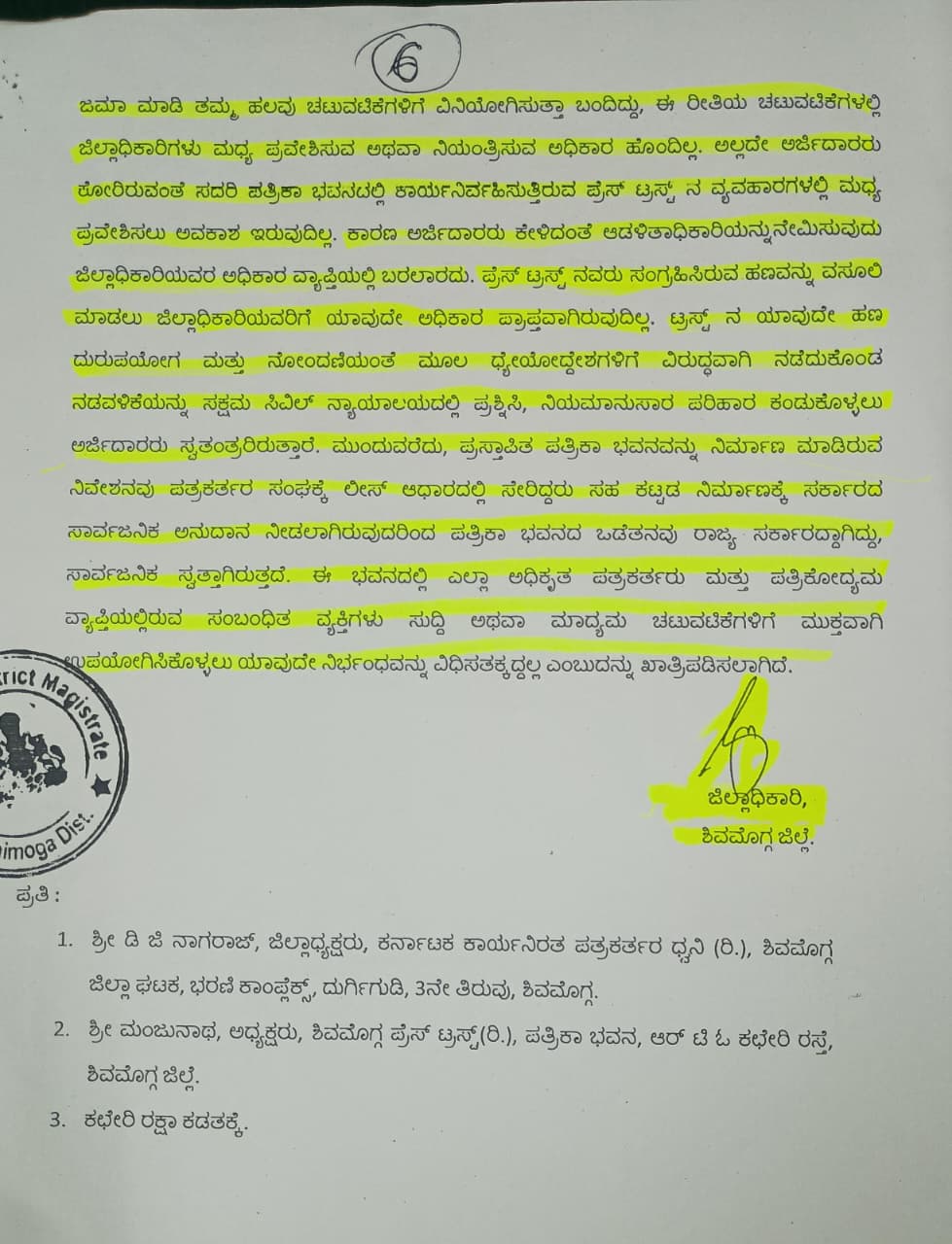 ಶಿವಮೊಗ್ಗ ನಗರದಲ್ಲಿ ಪ್ರತಿಷ್ಠಿತ ಪತ್ರಿಕಾ ಭವನವು ಶಿವಮೊಗ್ಗ ಪ್ರೆಸ್ ಟ್ರಸ್ಟ್ ನಿರ್ವಹಣೆಯಲ್ಲಿ ಸಾಗುತಿದ್ದು, ನಿಯಮಾಸಾರ ಕಾರ್ಯಚಟುವಟಿಕೆ ನಡೆಸುತ್ತಿದೆ. ಇದರ ಆಡಳಿತದಲ್ಲಿ ಜಿಲ್ಲಾಡಳಿತ ಹಸ್ತಕ್ಷೇಪ ಮಾಡುವುದಿಲ್ಲ ಎಂದು ಜಿಲ್ಲಾಧಿಕಾರಿಗಳು ಸ್ಪಷ್ಟನೆ ನೀಡಿದ್ದಾರೆ. ಆದಾಗ್ಯೂ ಕೆಲ ವ್ಯಕ್ತಿಗಳು ಪತ್ರಿಕಾ ಭವನ ಮತ್ತು ಶಿವಮೊಗ್ಗ ಪ್ರೆಸ್ ಟ್ರಸ್ಟ್ ಬಗ್ಗೆ ಅಪಪ್ರಚಾರ ಮಾಡುತ್ತಿದ್ದಾರೆ. ಪ್ರೆಸ್ ಟ್ರಸ್ಟ್ ಈ ವ್ಯಕ್ತಿಗಳ ವಿರುದ್ಧ ಈಗಾಗಲೇ ಕಾನೂನು ಹೋರಾಟ ಮಾಡುತ್ತಿದೆ ಎಂದು ಶಿವಮೊಗ್ಗ ಪ್ರೆಸ್ ಟ್ರಸ್ಟ್ ಅಧ್ಯಕ್ಷ ಎನ್.ಮಂಜುನಾಥ್ ಹೇಳಿದರು.