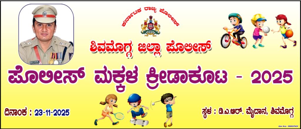 ನವೆಂಬರ್ 25 ರಿಂದ 27 ರ ವರೆಗೆ ಮೂರು ದಿನಗಳ ಕಾಲ ಶಿವಮೊಗ್ಗ ಜಿಲ್ಲಾ ಪೊಲೀಸ್ ವತಿಯಿಂದ ಶಿವಮೊಗ್ಗ ಜಿಲ್ಲಾ ಪೊಲೀಸ್ ವಾರ್ಷಿಕ ಕ್ರೀಡಾ ಕೂಟ – 2025* ನ್ನು ಹಮ್ಮಿಕೊಳ್ಳಲಾಗಿದೆ.