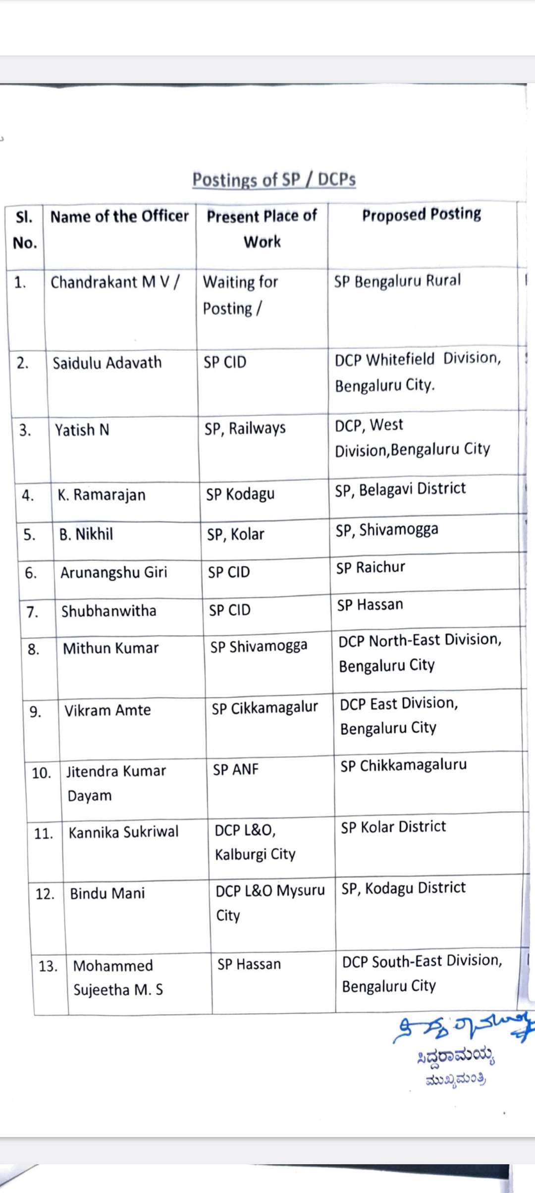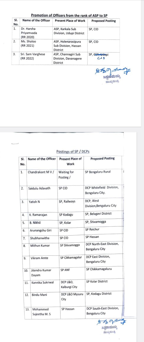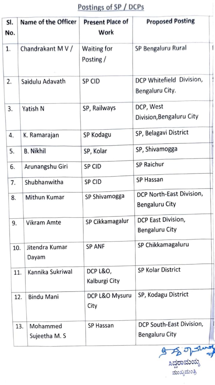 *ಶಿವಮೊಗ್ಗದ ಎಸ್ ಪಿ ಮಿಥುನ್ ಕುಮಾರ್ ಸೇರಿದಂತೆ ರಾಜ್ಯದಾದ್ಯಂತ ಎಸ್ ಪಿ ಗಳ ವರ್ಗಾವಣೆಯಾಗಿದ್ದು, ಯಾರು ಯಾರು ಎಸ್ ಪಿ ಗಳು ಎಲ್ಲೆಲ್ಲಿಗೆ ವರ್ಗಾವಣೆಯಾಗಿದ್ದಾರೆ?* *ಇಲ್ಲಿದೆ ಸಂಪೂರ್ಣ ಮಾಹಿತಿ*