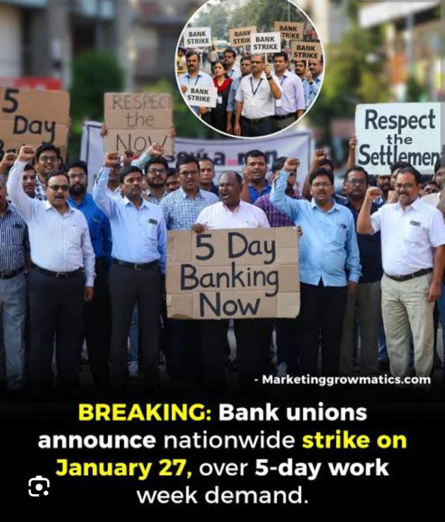 ವಾರದಲ್ಲಿ 5 ದಿನಗಳ ಕಾಲ ಮಾತ್ರ ಕೆಲಸ ಮಾಡಲು ಅವಕಾಶ ನೀಡಬೇಕು, ಶನಿವಾರ ಹಾಗೂ ಭಾನುವಾರ ರಜೆ ನೀಡಬೇಕು ಎಂದು ಒತ್ತಾಯಿಸಿ ಯುನೈಟೆಡ್ ಫೋರಮ್ ಆಫ್ ಬ್ಯಾಂಕ್ ಯೂನಿಯನ್ಸ್ (UFBU) ದೇಶಾದ್ಯಂತ ಜ.27 ರ ಮಂಗಳವಾರ ಮುಷ್ಕರ ನಡೆಸುತ್ತಿದೆ.