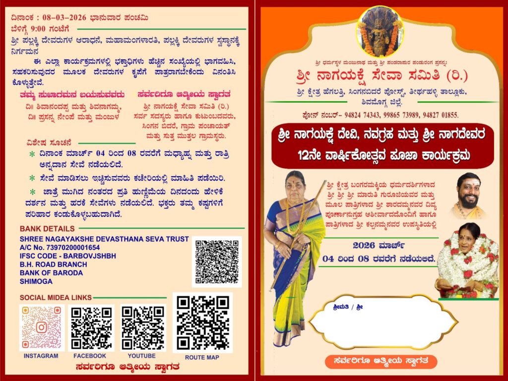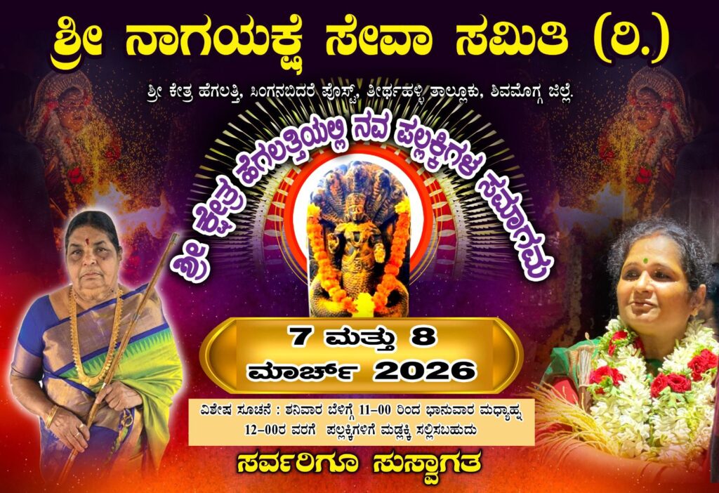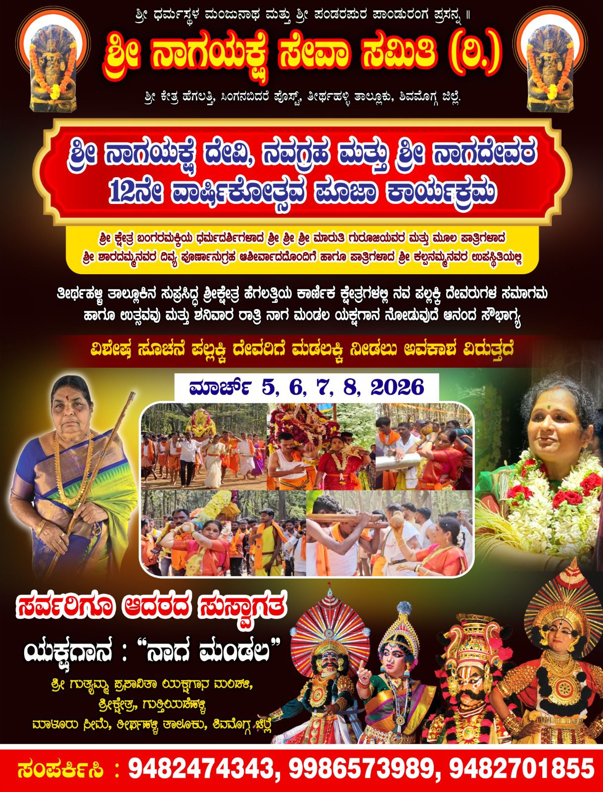 *ತೀರ್ಥಹಳ್ಳಿ ಶ್ರೀಕ್ಷೇತ್ರ ಹೆಗಲತ್ತಿಯಲ್ಲಿ ಮಾ.5ರಿಂದ 8ರವರೆಗೆ ಶ್ರೀ ನಾಗಯಕ್ಷೆದೇವಿ ನವಗ್ರಹ ಮತ್ತು ಶ್ರೀನಾಗದೇವರ 12ನೇ ವಾರ್ಷಿಕೋತ್ಸವ ಪೂಜಾ ಕಾರ್ಯಕ್ರಮ*